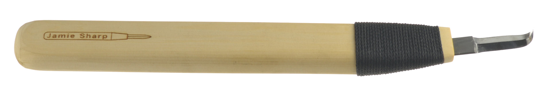 The handle is 9" to 11" long, made of yellow cedar and is longer than most knife handles. It is suitable for single or double handed use. Many artists really enjoy the extra length of these knife handles.
